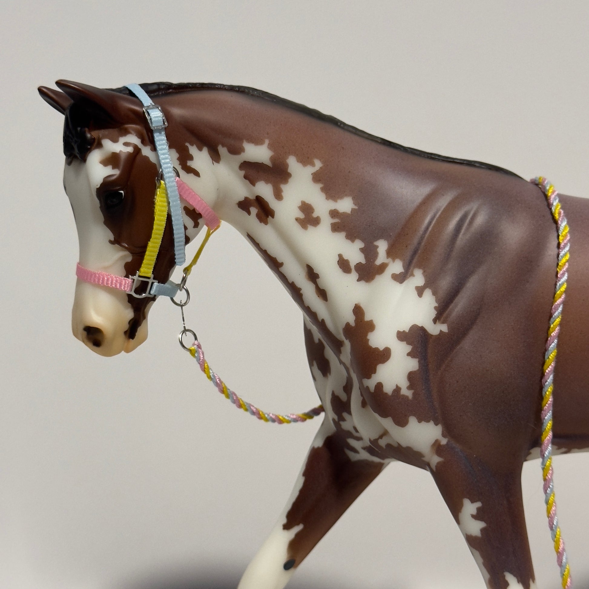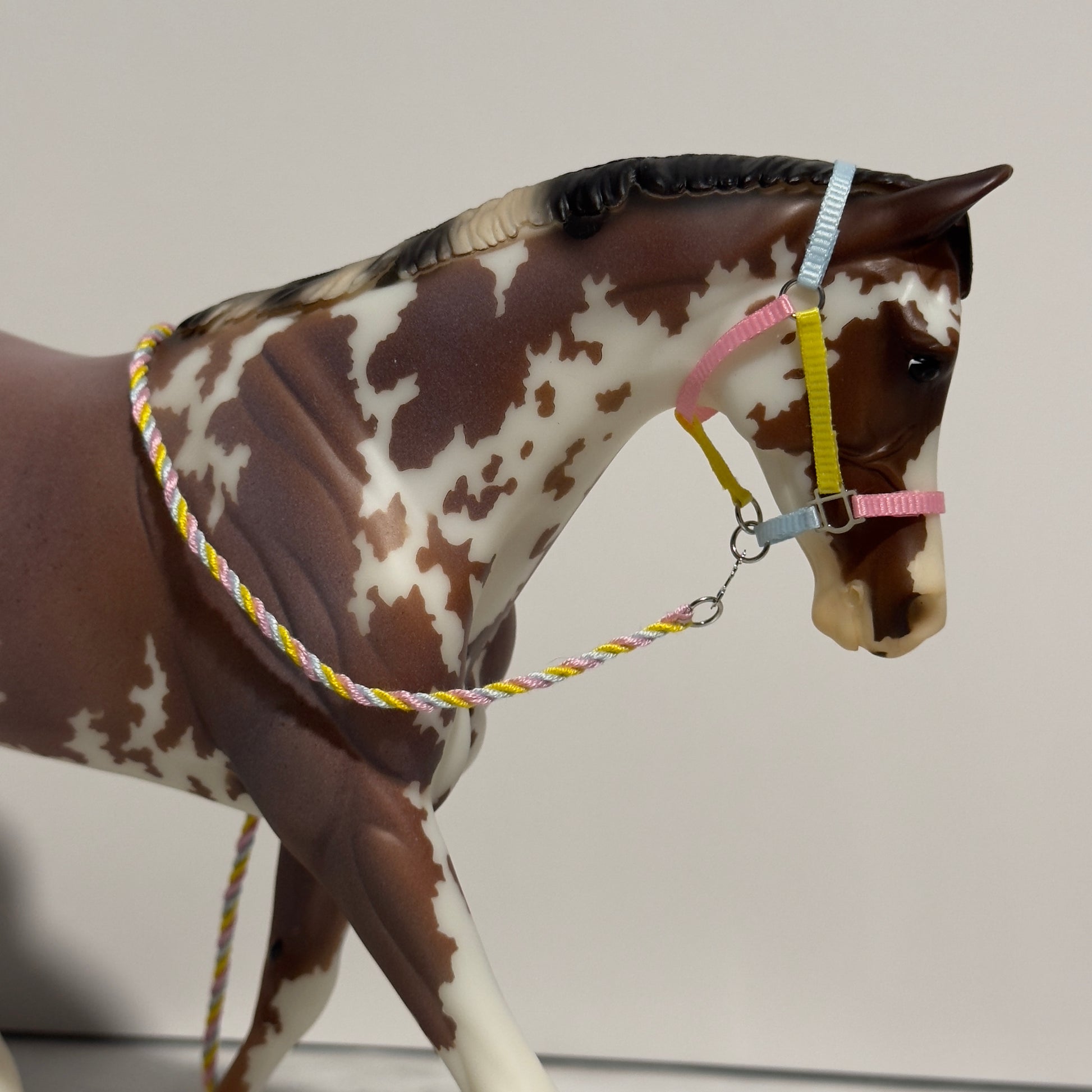 Each set includes a handmade halter with a realistic slotted halter ring design and easy to use buckle, as well as a braided lead rope with clip for easy removal. We pay close attention to detail and realism when creating our tack and accessories in order to provide the best quality for photography, showing, or gentle play.
