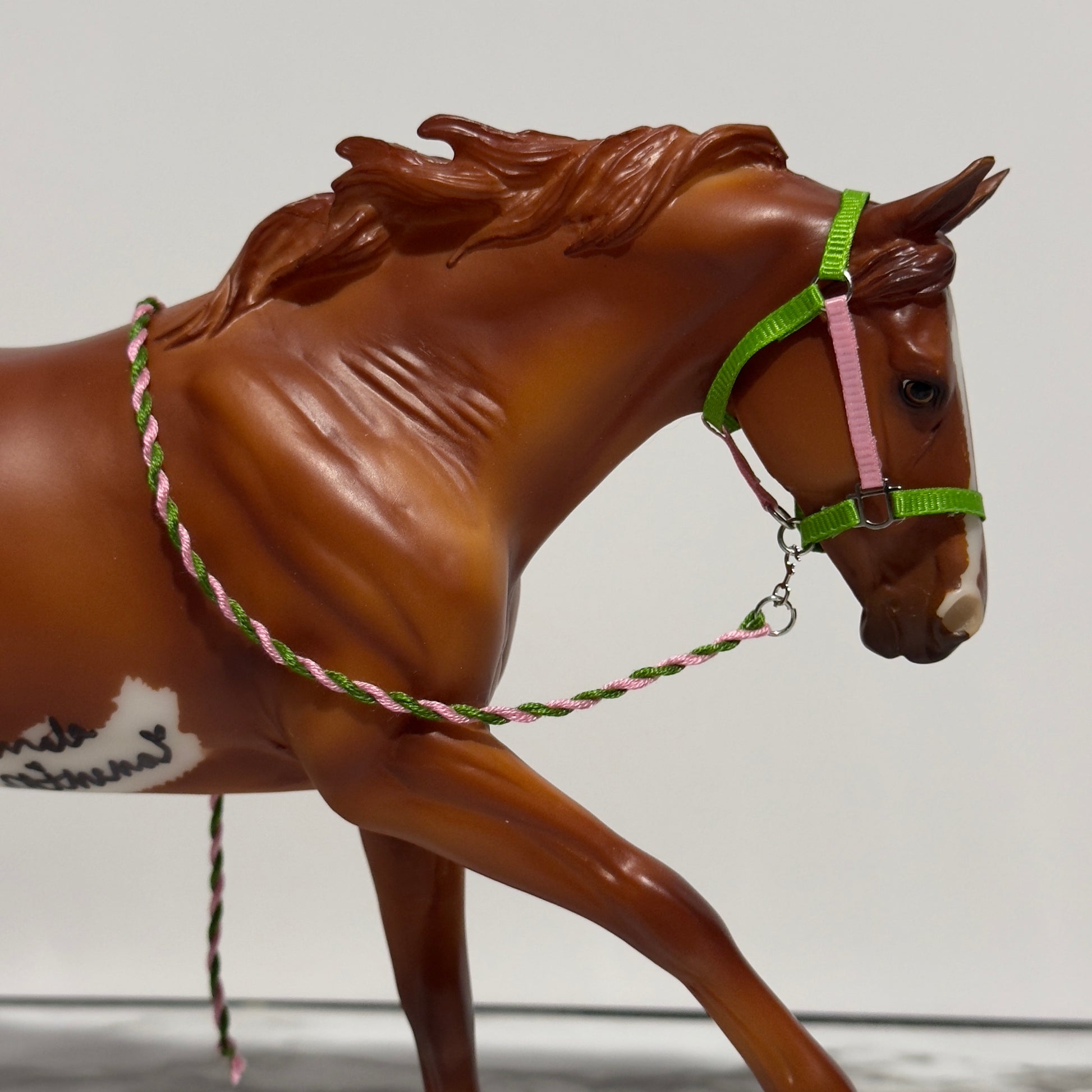 Each set includes a handmade halter with a realistic slotted halter ring design and easy to use buckle, as well as a braided lead rope with clip for easy removal. We pay close attention to detail and realism when creating our tack and accessories in order to provide the best quality for photography, showing, or gentle play.