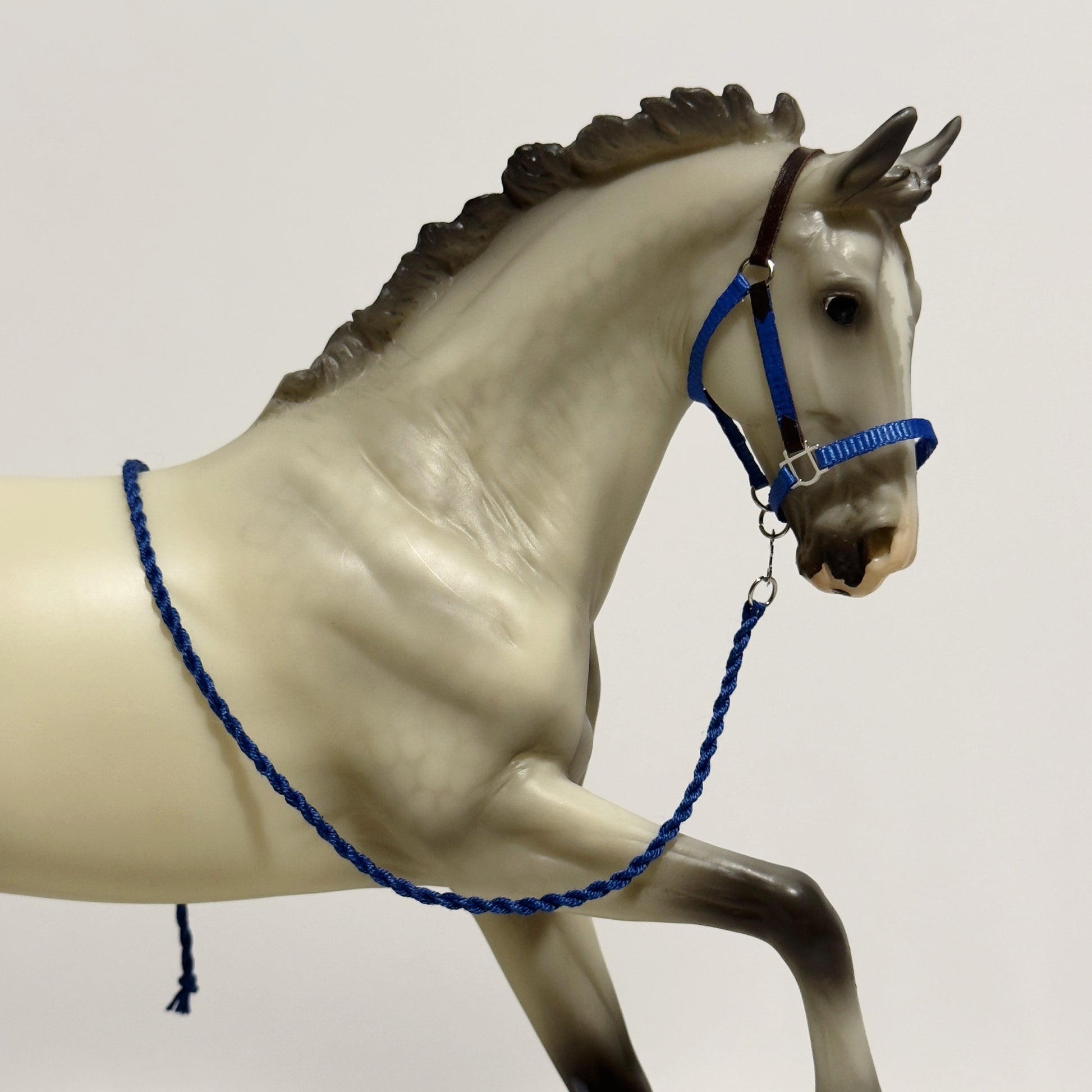 Each set includes a handmade halter with a realistic slotted halter ring design and easy to use buckle, as well as a braided lead rope with clip for easy removal. Our combo halters are made of both grosgrain ribbon and high quality leather lace for a breakaway look. We pay close attention to detail and realism when creating our tack and accessories in order to provide the best quality for photography, showing, or gentle play.