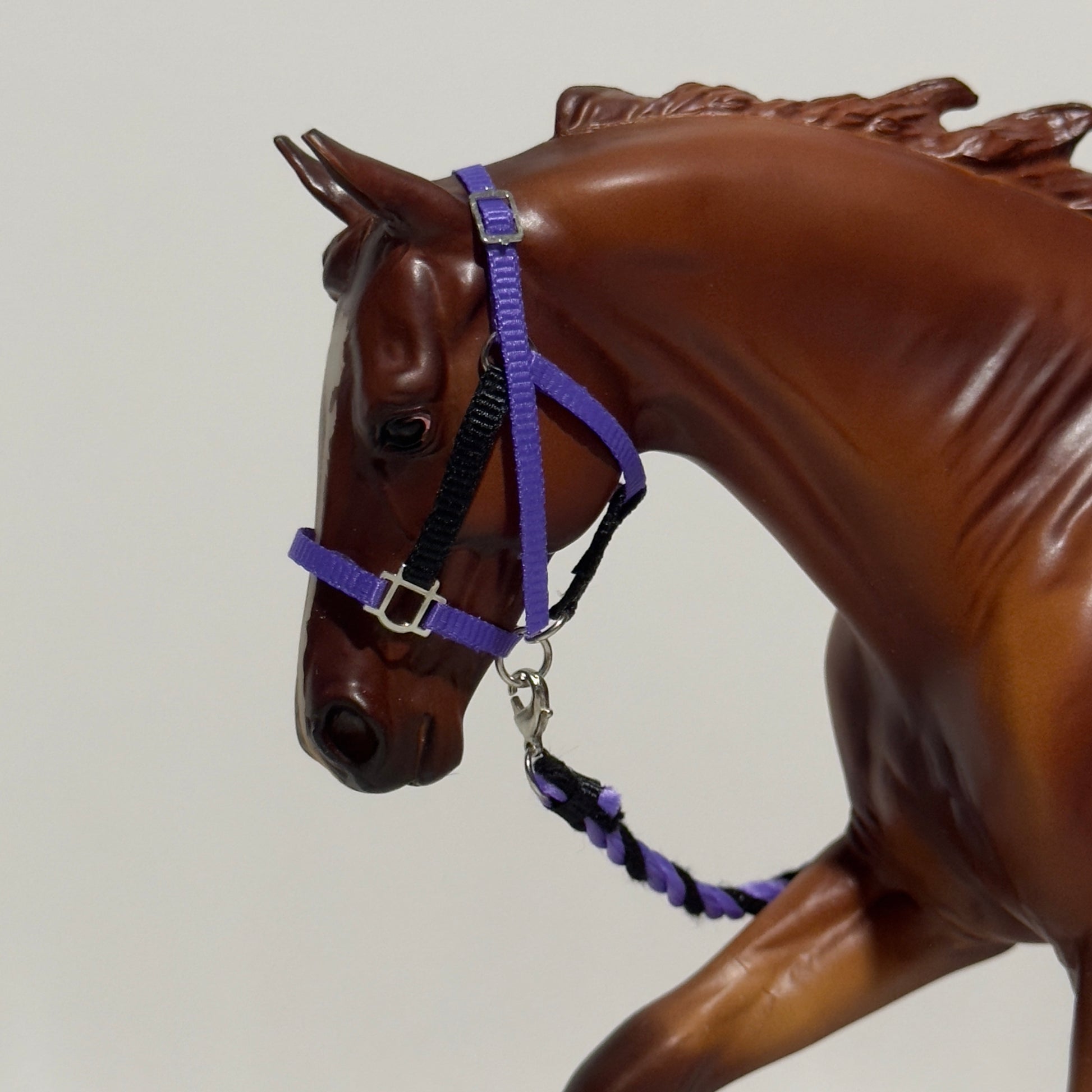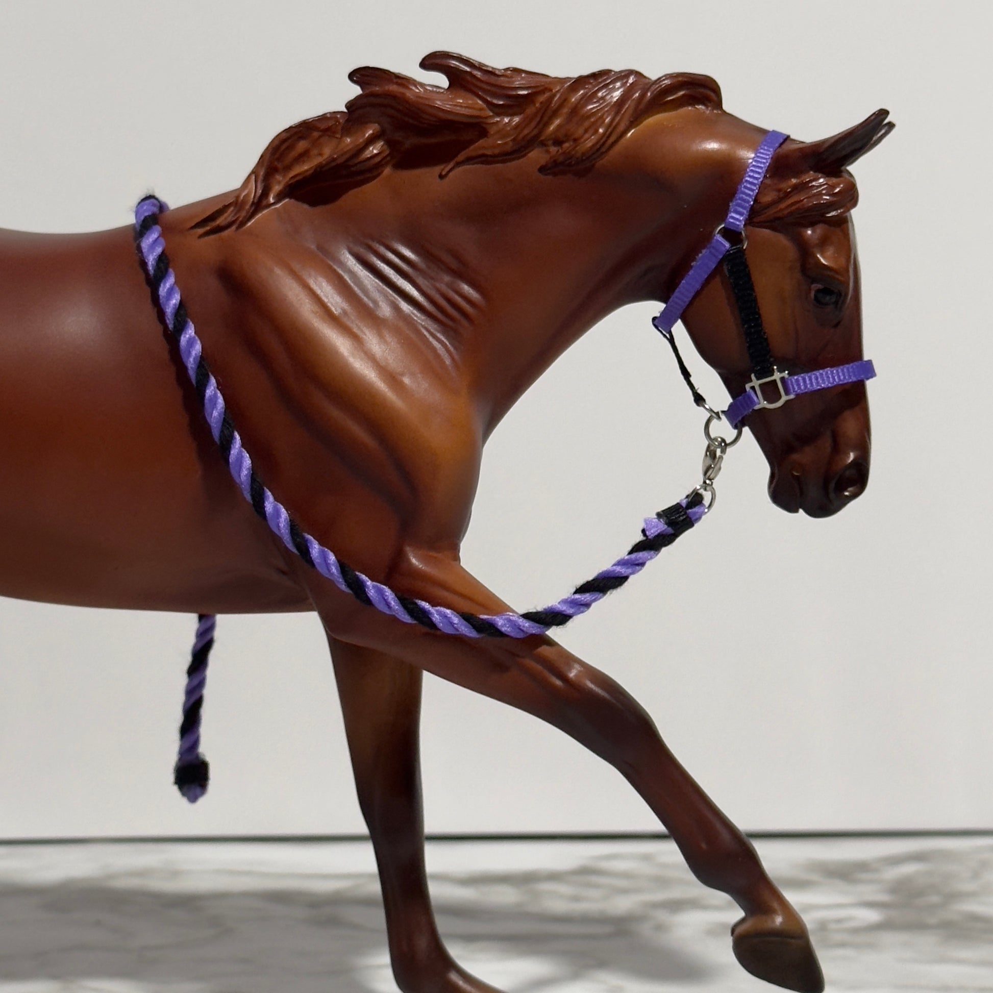 Each set includes a handmade halter with a realistic slotted halter ring design and easy to use buckle, as well as a braided lead rope with clip for easy removal. We pay close attention to detail and realism when creating our tack and accessories in order to provide the best quality for photography, showing, or gentle play.